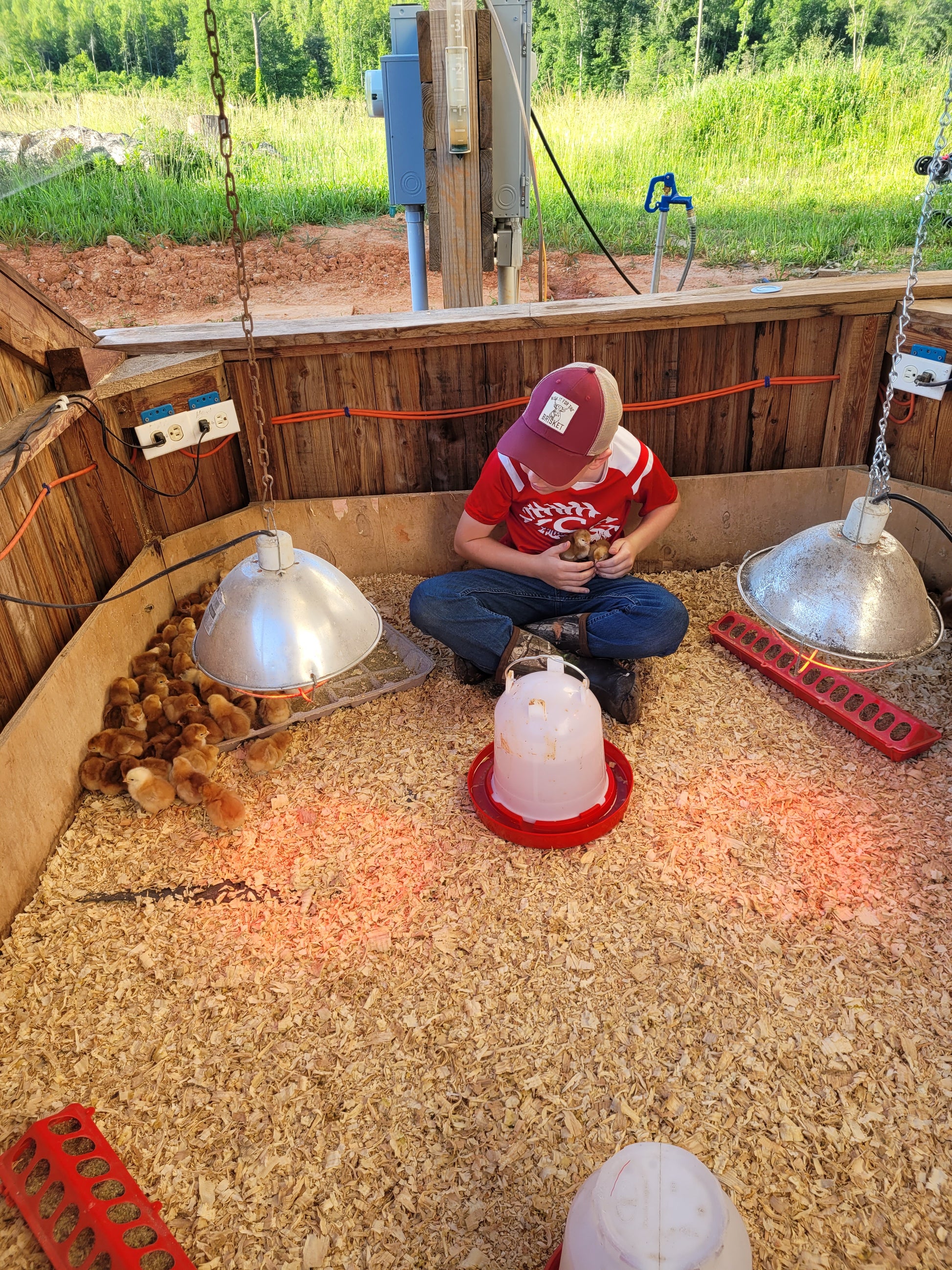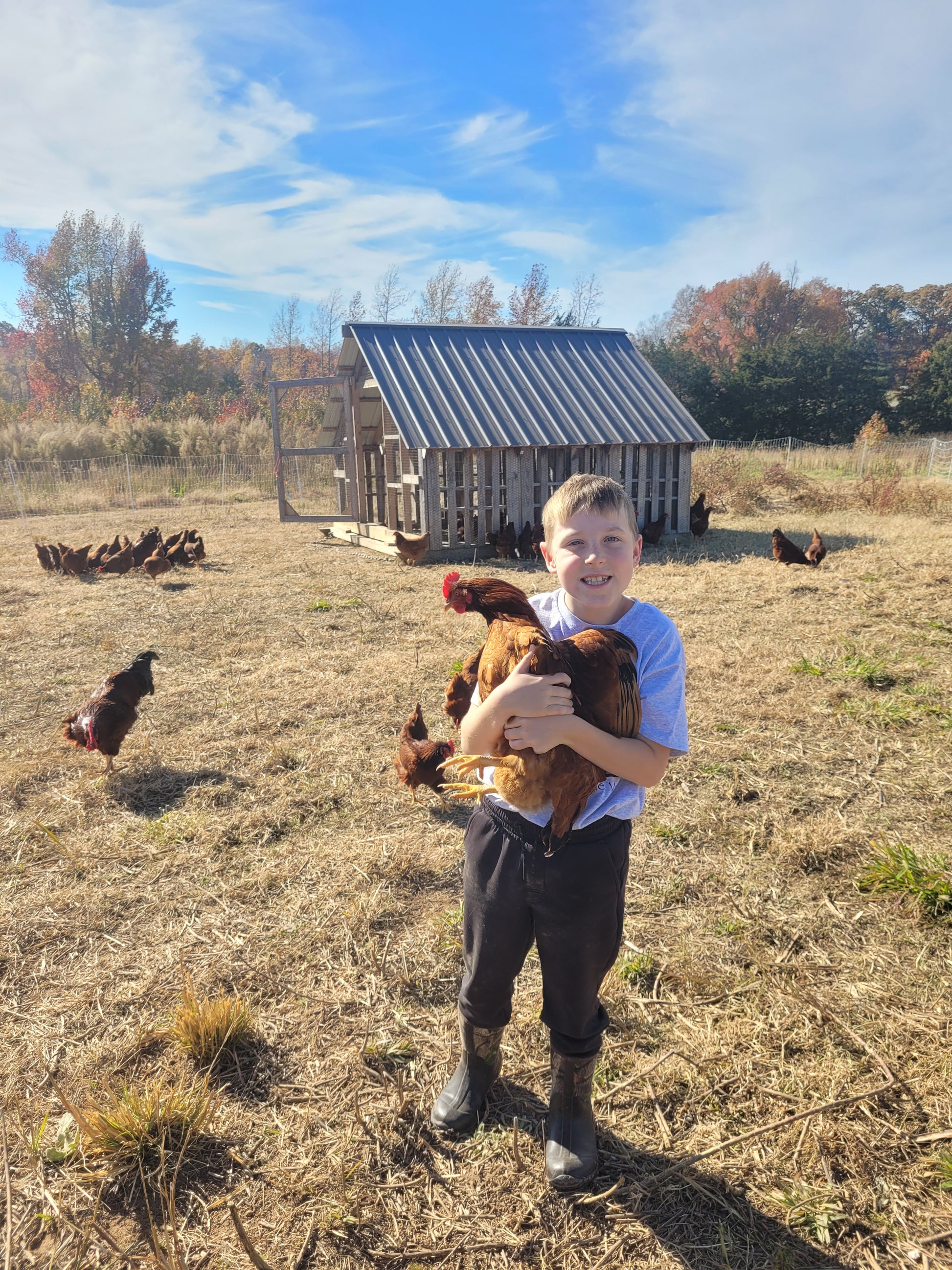 He has raised his chickens from day old chicks and cared for them every day since. Cole has chosen a local soy free chicken feed to supplement his birds in between bugs and other forages. They are are on open rotating pasture which makes them very happy and cared for chickens!